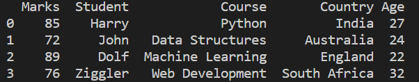 df1=df.loc[:,['Course','Marks','Age','Student','Country']]