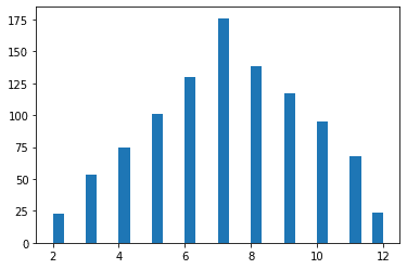 A histogram of the output shows that the maximum number of times the 7 was observed. Hence showing  Linearity of Expectation.