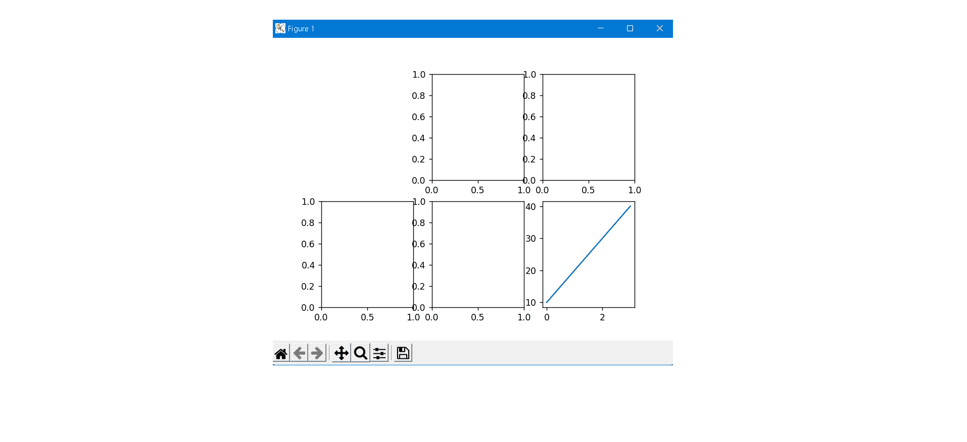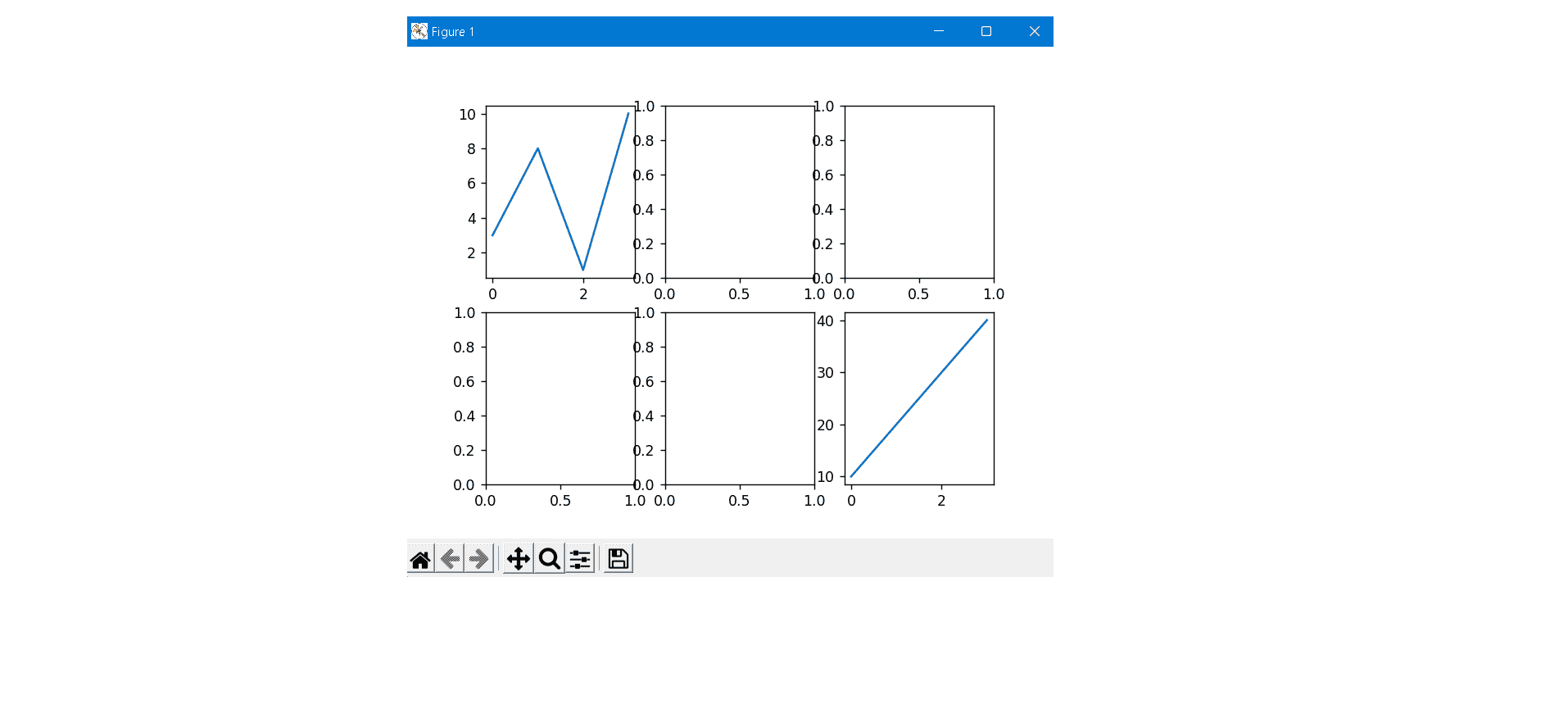 from matplotlib import pyplot as plt import numpy as np x = np.array([0, 1, 2, 3]) y = np.array([3, 8, 1, 10]) x1 = np.array([0, 1, 2, 3]) y1 = np.array([10, 20, 30, 40]) fig, axs = plt.subplots(2,3) axs[0][0].plot(x,y) axs[1][2].plot(x1,y1) plt.show()