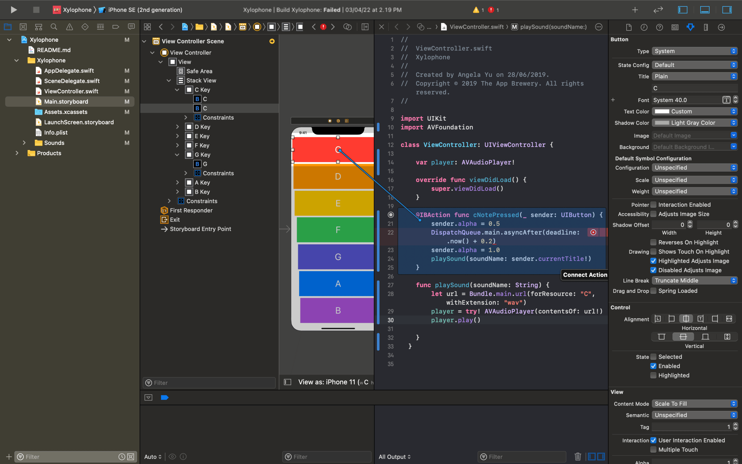 - For Action elements, that require input from the user like buttons, checkboxes, or textfields, we need to create an Action function that runs every time a button is clicked, held or released. For our button, we can simply create this function by opening the Assistant, shortcut: Control + Option + Command + Enter, and while holding the Control key drag the button on the code editor. Name this function “playOrPause”, as it will help with playing or pausing the sound later on.