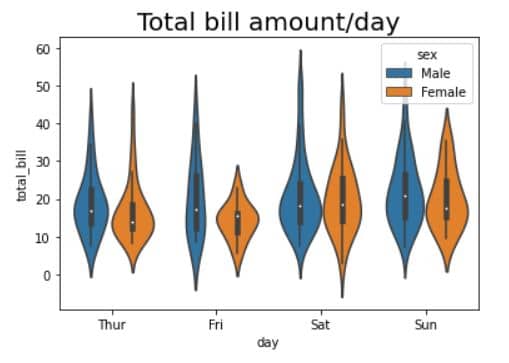 Suppose we want the information about the total bill amount per day and split it according to gender. We will plot a voilinplot as-