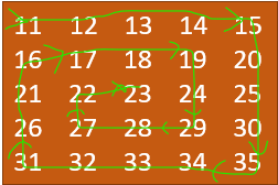 11 12 13 14 15 20 25 30 35 34 33 32 31 26 21 16 17 18 19 24 29 28 27 22 23