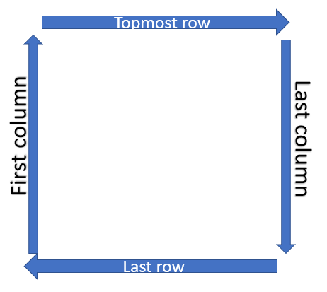 - Stop iterating through above four for loops when either current last column becomes lesser than current first column or when current top row becomes greater than current bottom row.